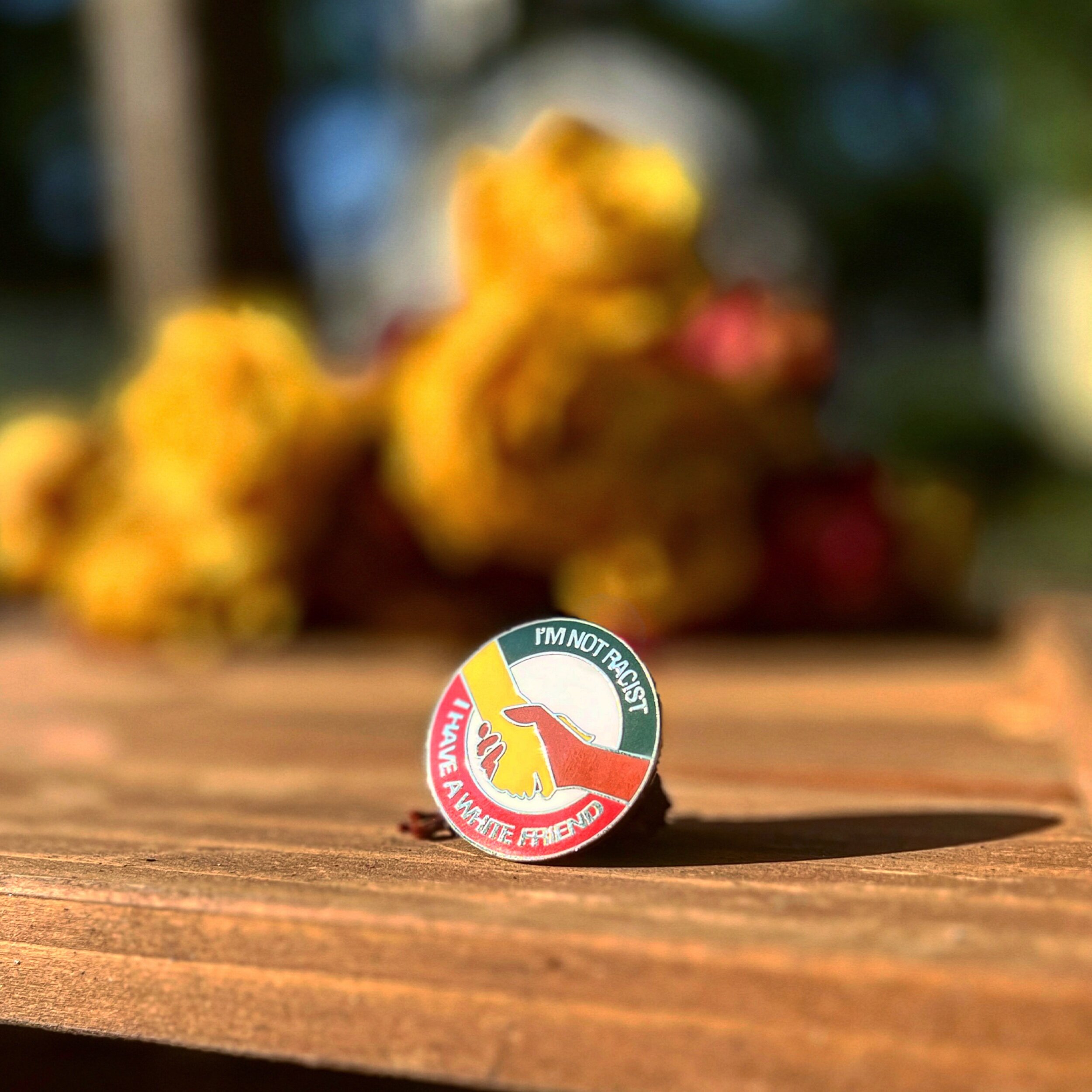 “I'm not racist! I have a Black friend!” Our newest drop “I’m not racist” pin pokes fun at this age old saying by flipping the races in irony & sarcasm. Start a great conversation with this hard enamel pin. 1.25 inches wide with 1 butterfly clutch. Pins sold as individual and come on 1 backing card.